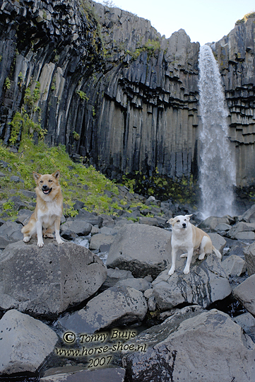 Timmy en Tritla bij de Svartifoss Ondanks de vooraf bepaalde compositie vind ik het beeld niet echt overtuigend. De natte rotsen onder Tritla bijvoorbeeld zijn lelijk, maar een logisch gevolg van een natte hond die op de rots springt (de rotsen liggen in het stroompje).